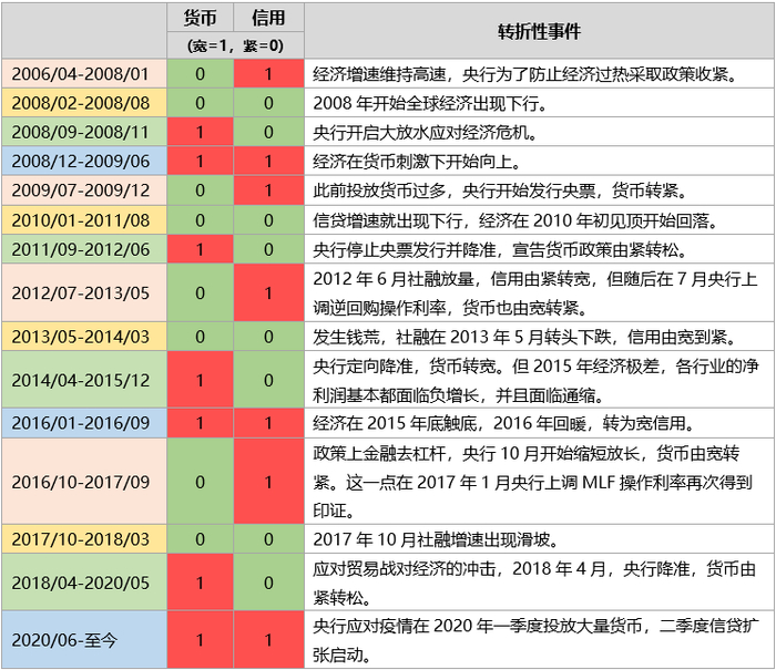 如何分辨我们当前所处的阶段呢?就货币的宽紧而言,我们根据央行的货币政策态度来进行判断,当然,中国的央行运作方式与美联储较为不同,由于中国央行的货币工具较为丰富,且货币政策的表态往往过于暧昧,比如“松紧适度”和“稳健中性”所表达的意思就截然不同,而且往往是货币政策已经宽松了一段时间或资金利率已经上行了一段时间,央行才出来表态说未来的货币政策发生变化,比如2016年10月开始货币政策实则就已经转向紧缩了,央行通过缩短放长的方式抬升了短端的银行间利率,叠加当时正值金融去杠杆时期,货币政策已然转向,但直至2017年1月才上调MLF操作利率。因此我们尽量去把握每一轮央行政策变化的细节,比如发行央票等,不仅仅局限于对准备金率、基准利率的调整。而信用端,我们通过结合往年的经济形势,并主要参考社融增速的数据去判断信用扩张的情况是宽松还是紧缩。由此得到如下周期,可以说从2006年至今,基本上中国经济经历了4轮周期:
