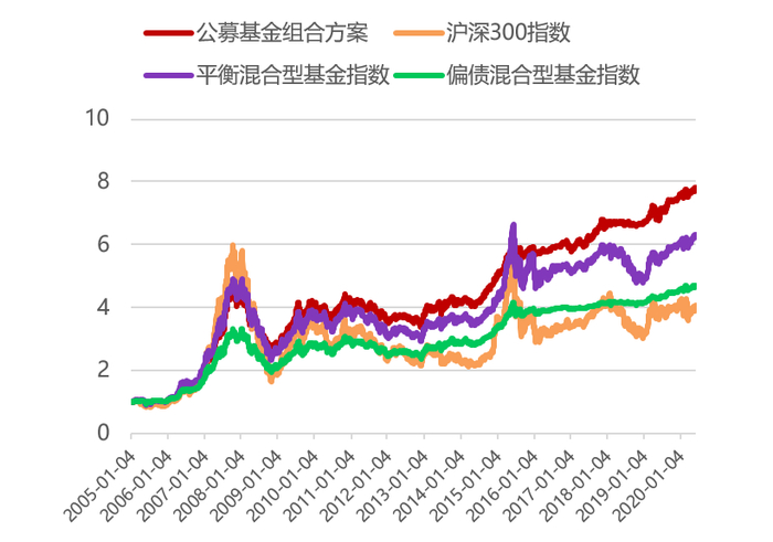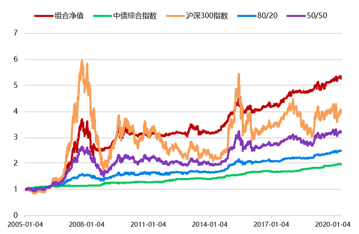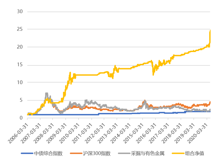 机构投资者可以通过保证金交易商品期货来参与商品的配置,但在实际投资中,很多个人投资者缺少直接参与商品投资的工具,且投资期货市场的保证金交易波动太大,并不适合非专业投资者,因此我们尝试用股票中的采掘、有色金属这两个行业来代替商品。替代后,我们得到如下收益走势图: