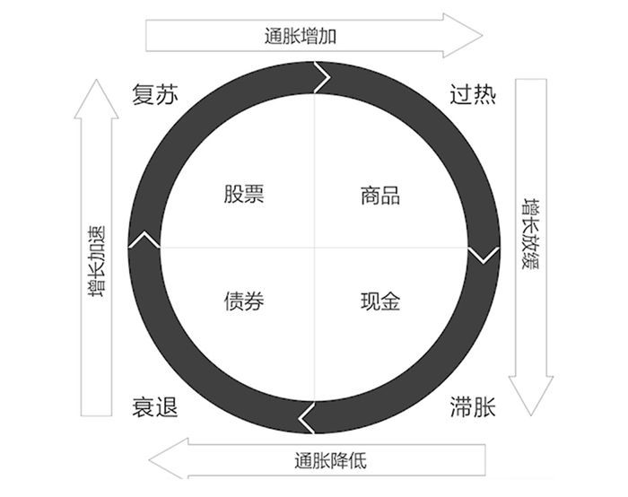 说到大类资产轮动模型,最出名的莫过于美林时钟。2004年美林证券用美国超过30年的数据统计得出的资产配置模型,把大类资产轮动与经济周期联系起来,通过探讨不同资产在通胀周期和经济增长周期两个维度下的优劣表现得出的详细投资建议,复苏期投股票、过热期投商品、滞涨期持有现金、衰退期投债券。美林时钟模型之所以出名,是因为它在美国市场的实践应用效果非常显著,在2004年推出后迅速被全球资本市场所热捧。
