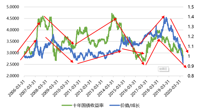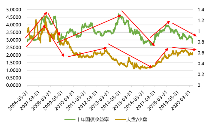 此外,利率水平的变化也会对大盘/小盘、价值/成长风格起到领先的指导作用。一般来说,利率上行往往伴随着大盘价值风格表现更好,利率下行则伴随着小盘成长风格更具优势。究其原因,利率水平与宏观经济联系紧密,在经济景气度较高的时候,企业可以承受更高的融资成本,利率水平一般也会上行,此时市场风格会偏向大盘价值,而经济景气度低的时候,需要用低利率刺激实体经济的融资活力,利率水平下行,而具有抗周期性的成长股会表现更好,市场整体更偏小盘成长风格。