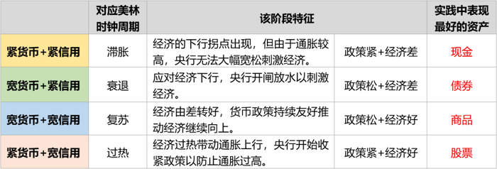 理解起来也并不困难,在衰退期和复苏期,央行的目标都是让经济持续升温,因此货币政策都是宽松的,在这个过程中,企业的融资需求由差转好,对应信用由紧到宽;而过热期和滞涨期,一来需要给经济降温,二来通胀高企,央行的货币政策需要偏紧缩,而信用扩张也会随着央行的货币收紧而由宽转紧。