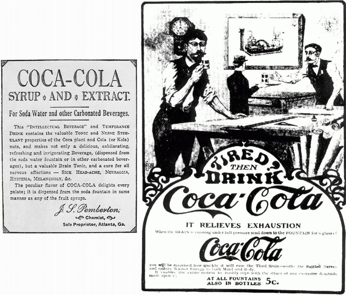 19世纪70年代,在美国偏远南方的一名药剂师约翰·彭博顿,第一次听说马利安尼酒以及其中的神奇物质-古柯(Coca),这是在南美几千年来被人们食用的 “草药”,可以“治疗百病”,甚至“通灵”。于是当时穷困潦倒并且还沾染上吸食吗啡的药剂师彭博顿,想做一个山寨的生意,调配自己廉价版本的“法式古柯酒” (French Wine Coca), 他利用自己的专业知识尝试不同的配方,但是主要物质就是南美的古柯和西非的柯拉果粉末(Cola)。经过几个月的努力,可口可乐的原型诞生了,其实Coca-Cola 本名就应该叫做 “古柯-柯拉果”保健饮。