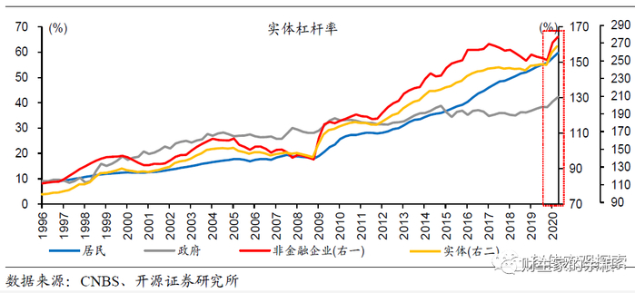 根据中国社会科学院国家资产负债表研究中心(CNBS)的数据,就在过去的半年里,中国实体经济杠杆率一改前几年的平稳态势,出现了大幅度的抬升,相比2019年底,整体抬升了21个百分点,目前是266.4%,为中国有史以来的历史新高——无论是非金融企业杠杆、政府杠杆还是居民杠杆,都全部创出历史新高(见下图)。