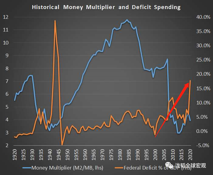 美国政府的财政赤字率,从2000年的盈余,飙升到2020年的18%。