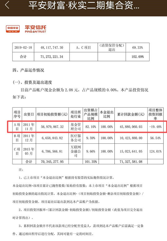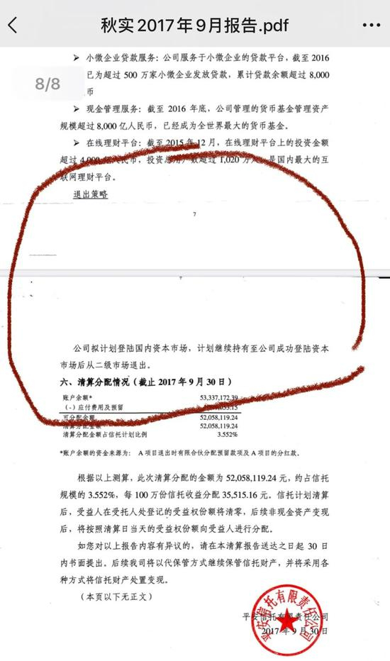 向《红周刊》记者报料的信托投资人表示,其初始投资100万元,几年时间过去,最终收到的本金+收益却仅有105万元。目前,该投资人已向深圳福田区法院起诉平安信托和春华资本。