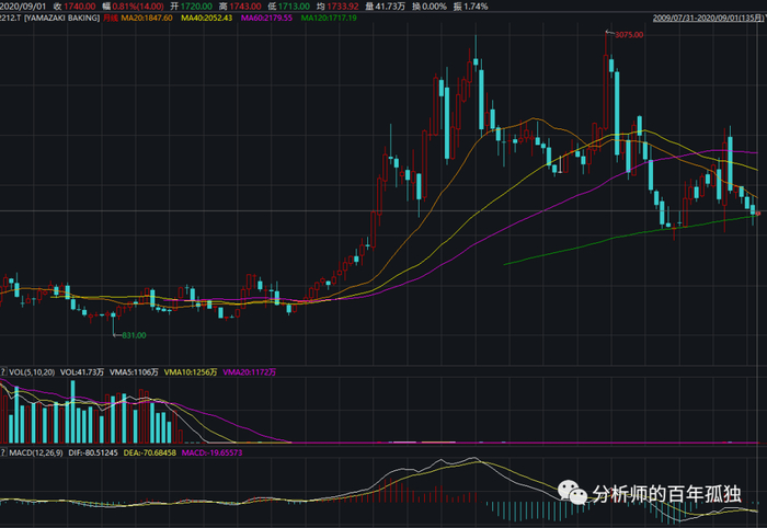 山崎面包业绩一般,目前市值不到40亿美金,市盈率30倍。