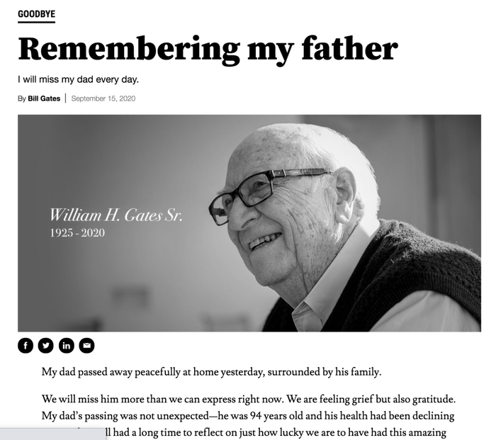 在这份缅怀文章里,比尔·盖茨饱含深情地写道,“父亲的智慧、慷慨、人情与谦卑,对世界各地的人产生了巨大的影响。” “我知道很多人都仰望他们的父亲,同样我也是。”