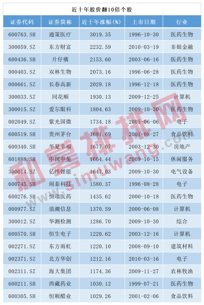 从近十年的十倍牛股行业分布来看,主要来自医药生物、电子、计算机、食品饮料行业,医药生物7只十倍牛股分别是西藏药业、恒瑞医药、爱尔眼科、长春高新、双林生物、片仔癀、通策医疗,上涨幅度在1030.12%-3019.35%。