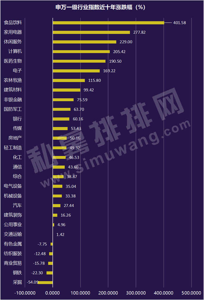 消费行业出牛股的定律颠扑不破,在最近十年,食品饮料以401.58%涨幅居首、同期医药生物也实现翻倍,此外包括家用电器、计算机、电子、农林渔牧等行业均实现翻倍。在28个申万一级行业指数中,也有包括采掘、钢铁、商业贸易在内的五个行业下跌,其中采掘行业指数跌幅更是高达54.09%。