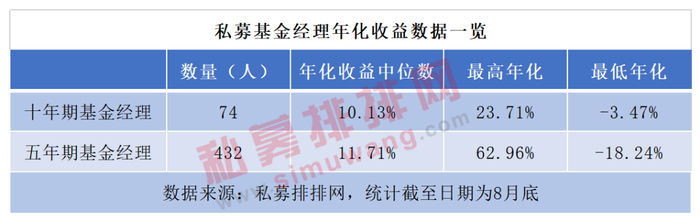在对基金经理做评价时,我们一般建议参考其五年以上过往收益,而从数据来看,全国的公募、私募基金基金经理加总起来,获得近十年年化收益10%以上的“高手”也并不多。本期发布私募基金经理年化收益榜,一方面,在拉长统计周期后发现,年化收益10%已是佼佼者;另一方面,本榜单也力争挖掘、展示更多市场上优秀的私募基金经理供投资者参考。
