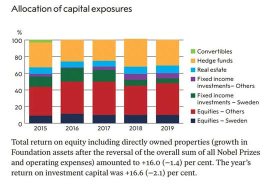 诺贝尔基金会管理着接近50亿瑞典克朗的资产,去年的投资收益为16.6%,近一半的资产投向是股票和期货。该基金会在2012-2019年期间引入了一个新的资产管理组织,并设立了一个活跃的决策投资委员会。该基金会的投资组合年均回报率为9.6%,在最近的五年中,投资组合的平均年回报率为7.3%。同期,基准指数的年平均回报率分别为8.4%和6.8%。