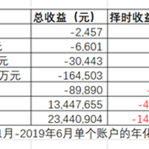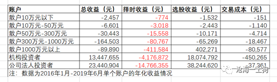 前一些时候,上交所公布了一个统计,2016年1月至2019年6月不同类型账户的年化收益情况。他们还把收益进行了归因,择时,选股和交易费用。