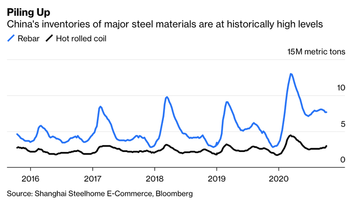 2020年10月9日,中国螺纹钢库存达到770万吨
