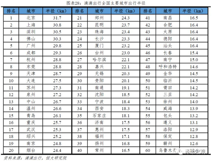 北京市域内集聚以科技创新、现代服务业为代表的高精尖产业,但职住平衡问题在全国最为突出。北京是全国科技创新中心,以中关村科学城、怀柔科学城、未来科学城为代表的科技创新平台,以亦庄、顺义为重点的创新型产业集群和“中国制造2025”创新引领示范区,以8所985院校、18所211院校为代表的高校科教资源形成了全国最优质的产学研合作创新生态系统。北京还聚集了金融、科技、文化创意、信息、商务服务等价值链高端的现代服务业,汇集中国20%的世界500强企业总部和459家A+H股上市公司。而一般性制造业和高污染、高耗能产业则严禁在北京发展。北京城六区以全市8.3%的面积集聚56%的人口,创造了70%的GDP。中心城区人口产业集聚度过高导致居住成本过高、通勤距离过长,周边新城的教育、医疗、公租房等资源配套不足也给就近居住带来不便。据滴滴出行测算的全国主要城市出行半径来看,北京以31.7公里居首位。轨道交通的出行半径一定会比滴滴出行统计的汽车更长,而北京轨道交通密度仅为0.09公里/平方公里(剔除生态涵养区),集中就业区与大型居住区之间、各新城与中心城区之间快捷通勤能力严重不足,例如回龙观-天通苑等大型社区通勤压力均较大。
