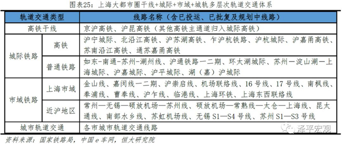 上海大都市圈积极打破行政区划壁垒,构建“干线+城际+市域+城轨”多层次轨道交通,为一体化大都市圈打下基础。干线及城际高铁满足城市之间远距离快速往来,市域铁路满足城市中心城市与周边城镇组团之间的中距离快速通勤,城市轨道交通满足城市核心区域内部通勤。上海大都市圈多层次轨道交通互联互通的蓝图正在逐步形成。高铁方面,上海向北连接南通的北沿江高铁启东—崇明段已纳入规划,向南京方向串联众多苏南经济强县的南沿江高铁已于2018年开工,向西连接湖州的湖苏沪高铁已获批,向南跨海连接宁波的沪嘉甬高铁也已纳入规划;此外,贯穿南通、苏州、嘉兴、宁波的通苏嘉甬高铁部分线路已在建,宁波到苏州、上海的时间将从2小时以上大幅缩至1小时左右。上海大都市圈轨道交通体系规划打破行政区划壁垒,将实现跨地区、不同层次的轨道交通互联。已批复的苏州-淀山湖-上海城际铁路将与上海市域铁路贯通运行,使江苏近沪地区与上海中心城区融合更加紧密;沪平城际铁路或与上海金山线贯通运行。苏州S1-S3号线兼具城市轨道交通与市域铁路的功能,将串联苏州与上海的地铁网;无锡S1-S4线计划连通无锡市区与江阴、宜兴、常熟、张家港等县级市,未来也有连通上海的可能性。