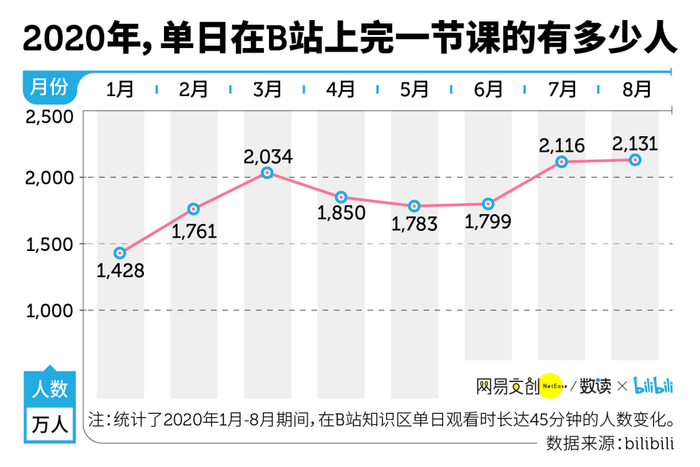 如果一节课是 45 分钟,在 B 站知识区看完 45 分钟的视频算一节课,2020 年 1 月,单日在 B 站成功“上完一节课”的就有 1428 万人,8 月份则增加到了 2131 万人。
