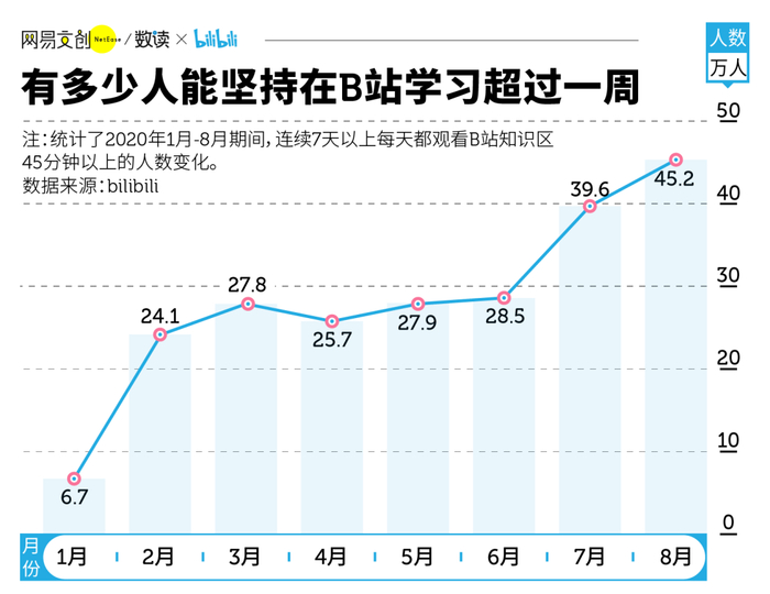 今年 1 月,有 6.7 万人每天在 B 站知识区观看了 45 分钟以上的内容,并且连续坚持了一周以上。到了 8 月,这个数字增长到 45.2 万人。