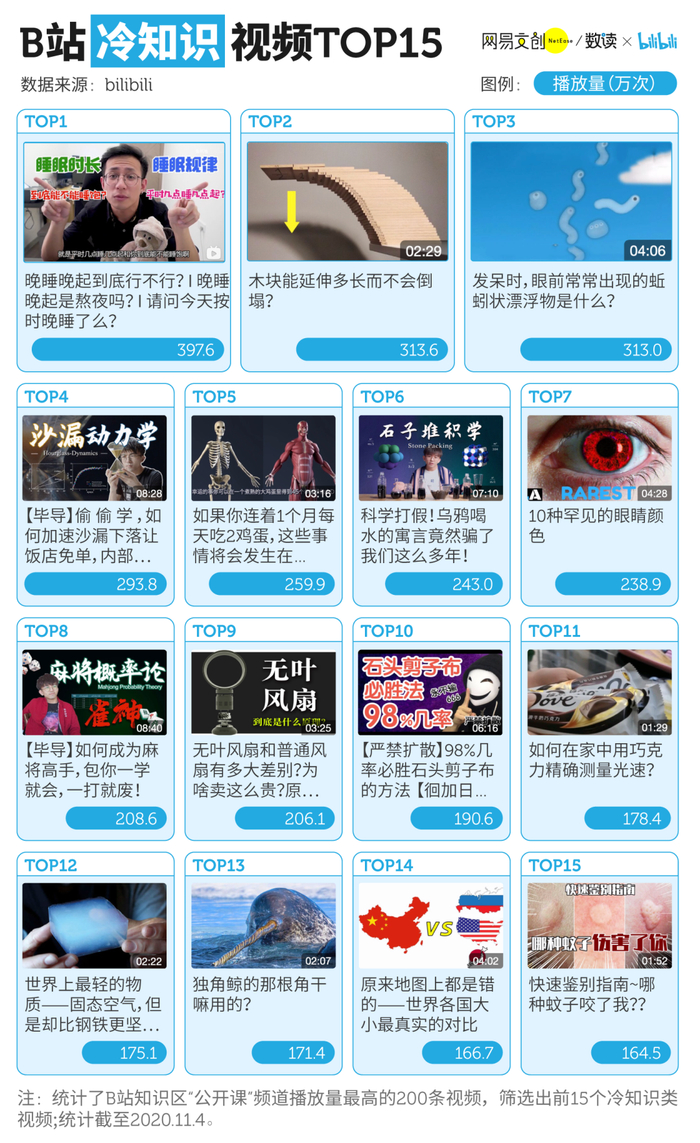 “晚睡晚起到底行不行?晚睡晚起是熬夜吗?”“木块能延伸多长不会倒塌?”“发呆时,眼前常常出现的蚯蚓状漂浮物是什么”,这是 B 站最火的 3 个冷知识视频,播放量均超过了 300 万。