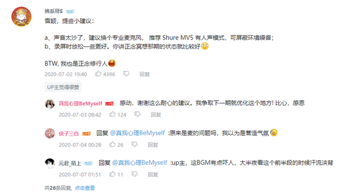 比如在知识区 UP 主“真我心理BeMyself”一条讲述上瘾的心理学原理的视频下,有同学提出建议:“声音太沙了,建议换个专业麦克风。” UP 主雪颖看到后就当即回复,并表示争取下一期就优化这个地方。