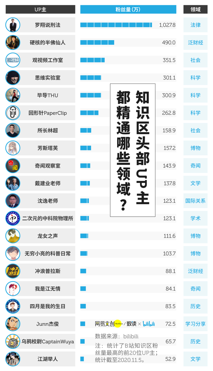 粉丝数最高的这些 UP 主,精通的领域从法律、社会、泛财经、科学,到文学、历史、学习分享,囊括了年轻人主流和非主流的知识需求。
