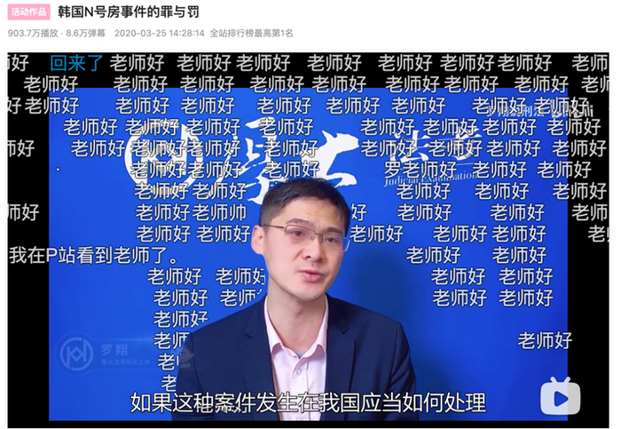 我们统计了这 20 位 UP 主播放量较高的热门视频,发现罗翔最受关注的刑法视频是侵害女性权益的“韩国 N 号房事件”,达到 903.7 万次播放量。在刑法案件讲解之外,他入驻 B 站和 11 周年演讲的视频也获得了相当高的热度。