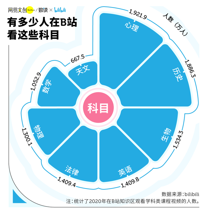 2020 年,有 1921.9 万人在 B 站观看过心理学相关的课程,其次是历史和生物。