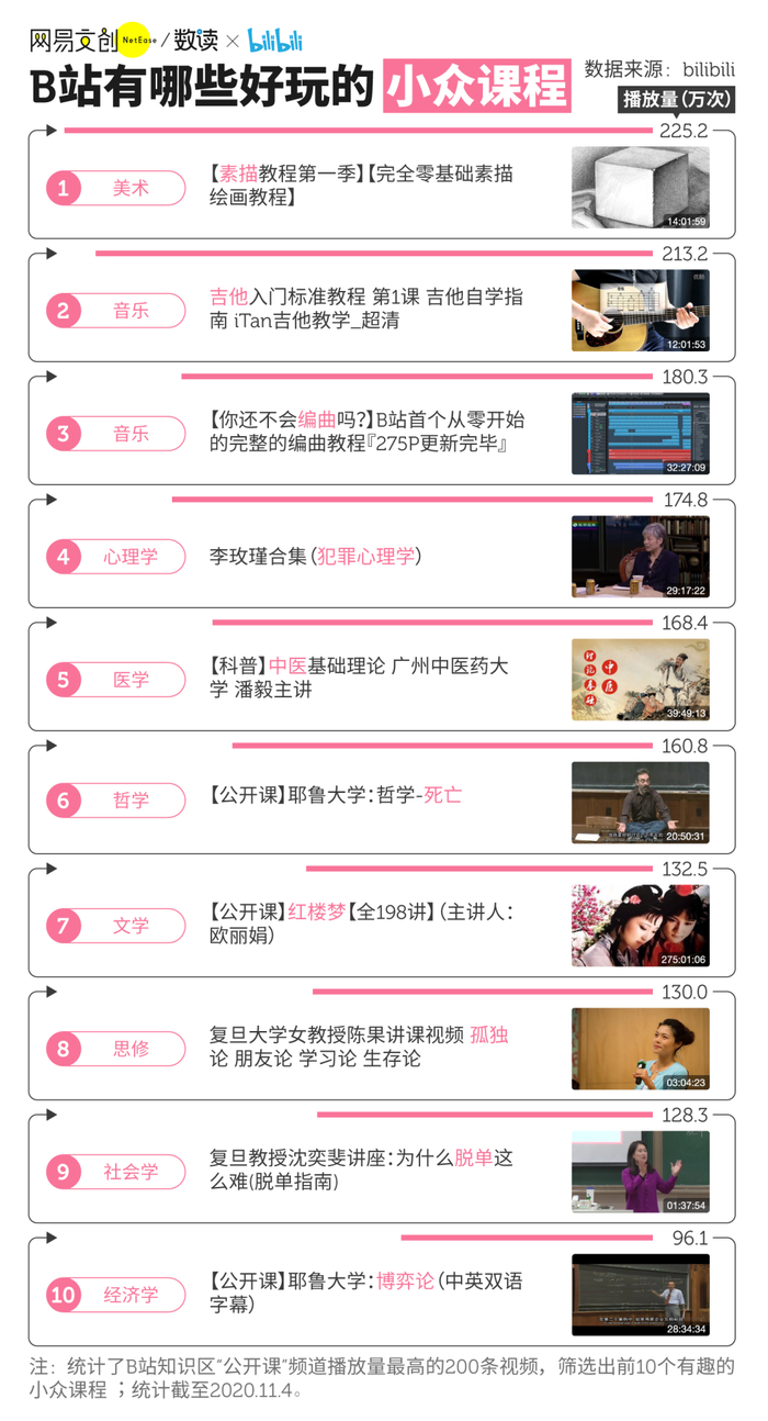让年轻人最欲罢不能的,莫过于知识区好玩的小众课程,这些在大学里永远也抢不到的课程,同学们自发在 B 站收集整理起来。素描、吉他、犯罪心理学、红楼梦,甚至是网红教授陈果的思修课和耶鲁大学的博弈论,都能在 B 站找到。