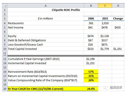 在2006年到2015年的十年间,CMG投资12.5亿美元,增加了4.35亿美元的利润,增量资本回报率高达35%:
