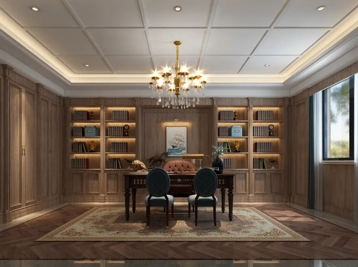 书房主人区分工作空间以及私人空间的重要场所,也是日常思考以及进行重要洽谈的场所。在布置上,书桌前方宜留有空间,有靠山、案山相呼应为佳。
