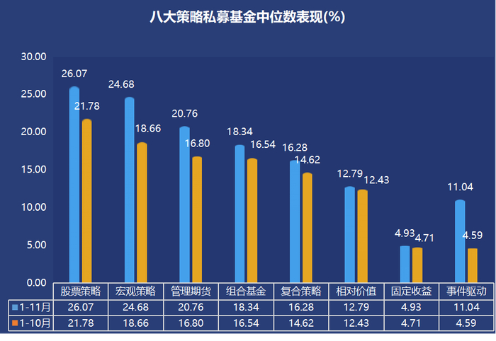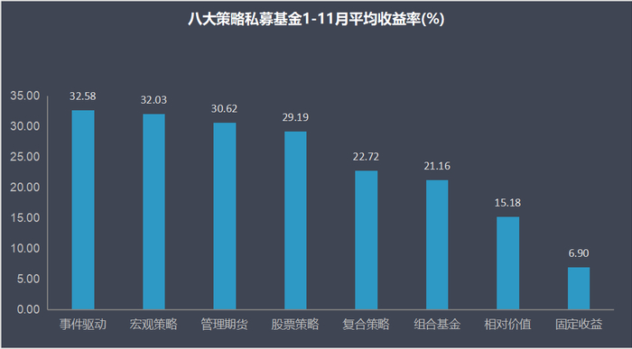 以下为八大策略私募基金前11月排行榜: