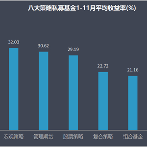 从八大策略收益表现来看,事件驱动策略跃居成为年内平均收益之冠,今年以来平均收益达到32.58%。此外,宏观策略、管理期货策略年内平均收益均超过30%,分别为32.03%、30.62%。9067只股票策略基金1-11月的平均收益为29.19%,另有复合策略平均收益22.72%,组合基金平均收益21.16%。