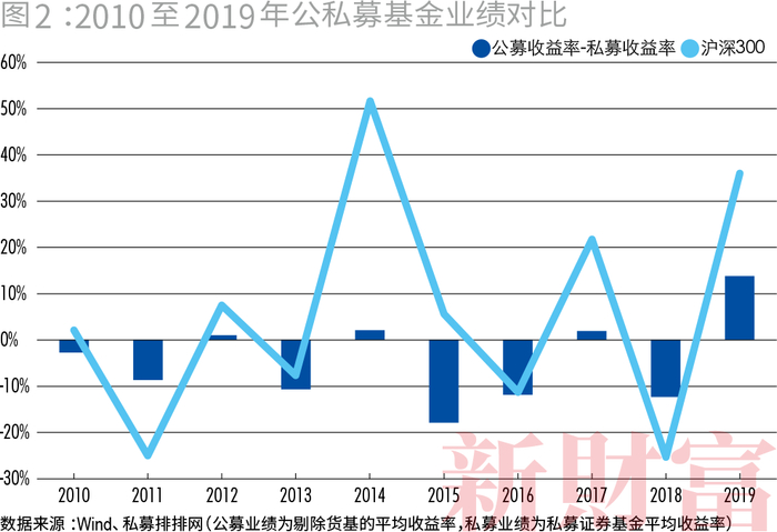 对比公、私募基金过去十年的收益率,可以发现,2010至2019年,除2010、2015年外,沪深300年度涨幅为正时,公募基金的收益率均高于私募基金;沪深300年度涨幅为负时,私募基金的收益率均高于公募基金(图2)。