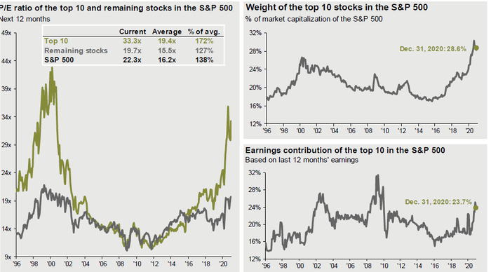 过去几年美股另一个趋势是,大公司变得越来越大,也获得了更高的估值。美股前十大市值公司的平均市盈率33.3倍,超过标普500平均市盈率的22.3倍。前十大公司占标普500权重28.6%,占盈利权重23.7%。