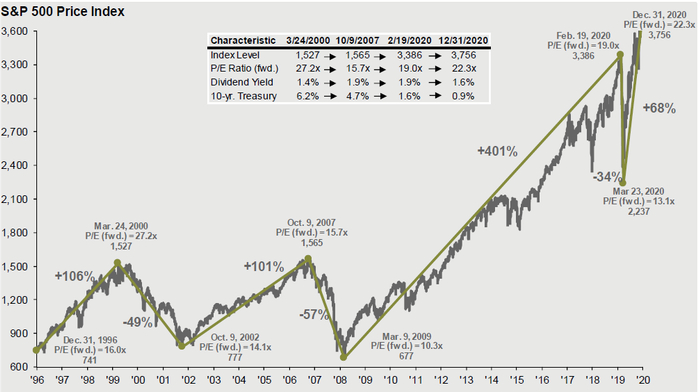 我们先来看一个“全景图”,截止到2020年底标普500对应22.3倍市盈率,超过了2007年高点的15.7倍,但是低于2000年互联网泡沫的27.2倍。另一方面,10年期国债收益率从2000年的6.2%下降到了今天的0.9%。在2020年标普一度暴跌34%,但是之后反弹了68%,指数继续创历史新高。
