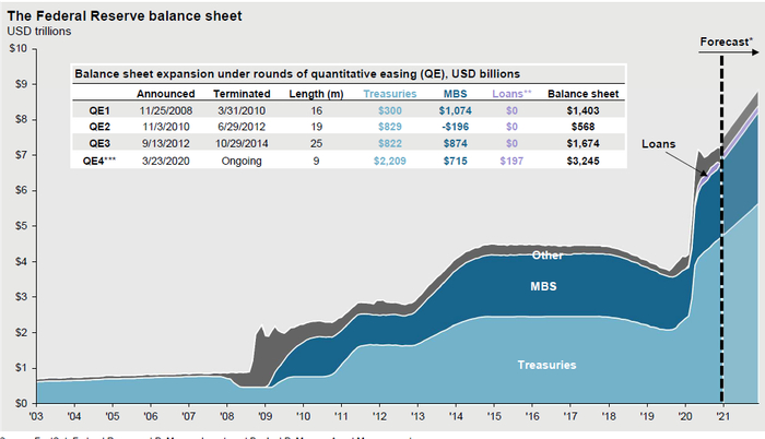 美联储资产负债表的变化,我们看到在2020年又出现了一次巨大的跃升。到了2021年,预计会再一次放松流动性。从QE1已经发展到了QE4……