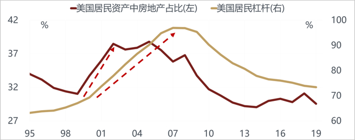 美国居民在房地产和股票上的配置基本上都是在20—40%范围内波动,此消彼涨。现在股票配置处于历史波动区间的高点,房地产的配置处于历史波动区间的低点,有很大可能会在未来十年会像中国过去十年一样增加房地产的配置,减少股票的配置。美国房地产的租金回报率在次贷危机后并没有明显下降,而债券收益率和股票分红率则持续回落,即使扣除房产税,美国房地产的投资价值相对于债券和股票也是上升的。美国居民如果加大房屋配置,推动房价上涨,可以利用已有房屋的增值进行抵押获得更多的贷款,会进一步强化其加杠杆能力。所以当房价涨的时候,也会带动其他消费需求上升,财富效应非常明显。