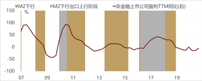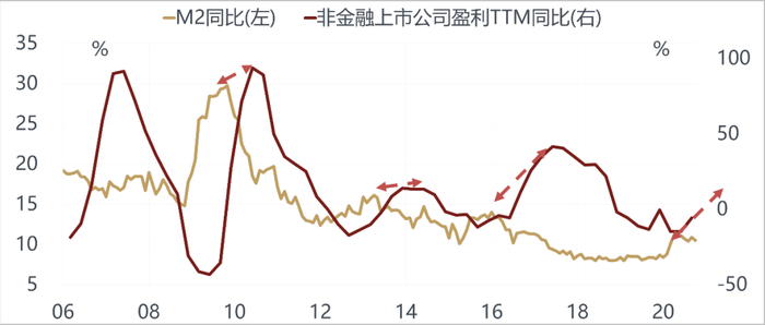 另外一方面,上市公司的盈利确实在恢复当中。一般来说,M2大概会领先上市公司盈利至少6个月的时间,所以即使现在M2的增速开始见顶回落,上市公司的盈利仍然可以维持到明年上半年是上升的,但是明年下半年还能不能继续保持上升的态势不好说。