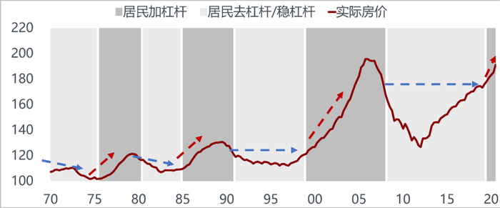 房价的上涨会带动美国房地产投资起来,进而提升商品的需求。美国盖房子不用螺纹钢,是用木头,所以用美国房地产投资的逻辑做多螺纹钢肯定不对,但是房地产投资周期会带动居民整体消费需求的上升,在美国房价上涨的时期美国的股票大概率会跑输房地产,因为房价上涨带动通胀压力上升,利率水平会上升,股票估值会下降。历史有一个相似性,上一轮居民加杠杆带动美国房地产周期启动的时候,正好是纳斯达克科网泡沫破灭的时候。2000年大家炒互联网,现在大家炒新能源汽车,长期战略方向都是对的,但是股价已经充分透支了未来的增长预期。所以美国本轮房地产周期一旦起来,对美国科技股的潜在风险要高度关注。