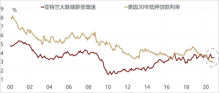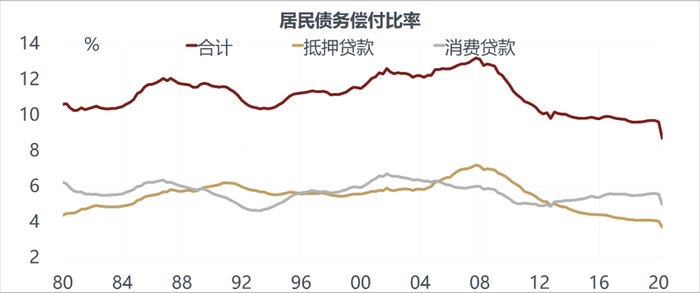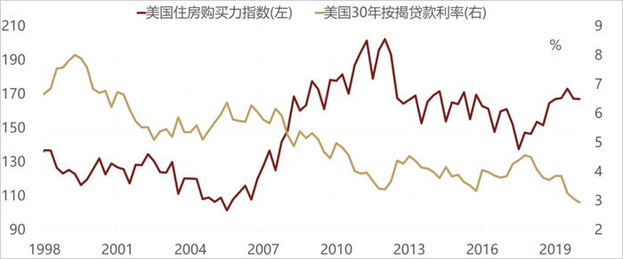 购买力方面,美国居民的杠杆率从2008年之后一直是回落的,现在美国居民的杠杆率在三大部门当中是最低的。居民的债务和收入的比例现在处在80年代以来的最低水平,债务负担已经很轻,美国按揭贷款利率已经跌破3%,已经低于美国正常薪资的增长速度,利率足够低,居民的购买力开始显著上升,一定能够把买房的意愿和冲动给刺激起来。