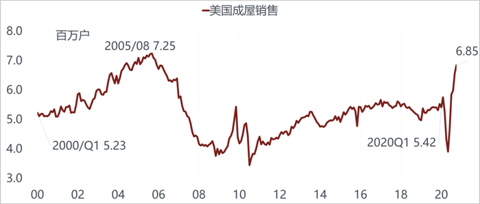 为什么现在中美有了切换?美国在这一轮疫情之后恢复最快的经济数据不是消费,是房地产。美国的房地产销售已远远超过疫情前的水平,现在几乎接近上一轮次贷危机房地产销售高峰的位置。