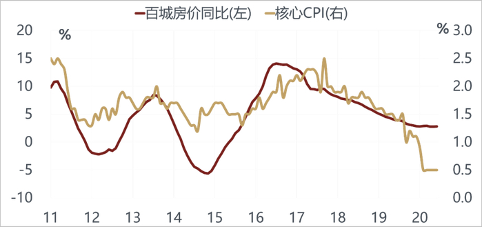 中国的核心CPI走势和房价走势基本是一致的,如果房价同比没有出现显著的上升,中国并没有真正意义上的通胀压力。核心CPI目前只有0.5%,是过去十年的最低水平。