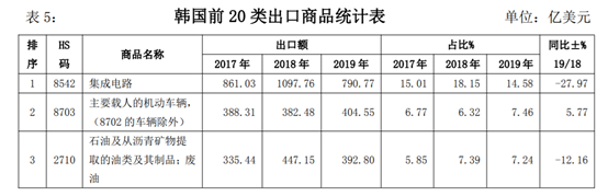 半导体和汽车是韩国最大的两个出口商品,2019年韩国集成电路出口占到了14.58%,是唯一占比超过10%的商品,这个数字在2018年甚至高达18.15%。