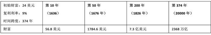 举个例子,假设1626年拥有24美元,如果按照年化9%的投资收益(复利)计算,那么374年之后,这就会变成2368万亿,相当于1000多个苹果公司,100多个美国的财富。