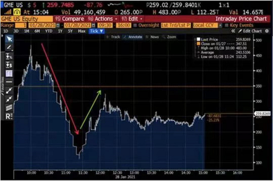 丑陋点三:华尔街的空头们,在散户限制交易买入交易之前,最后还不忘割散户非菜一把(这是我认为最丑陋的一点)。我们看下图。