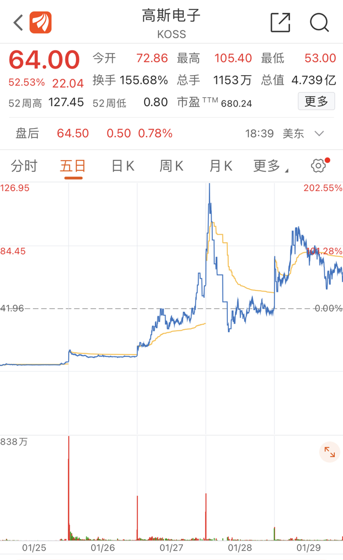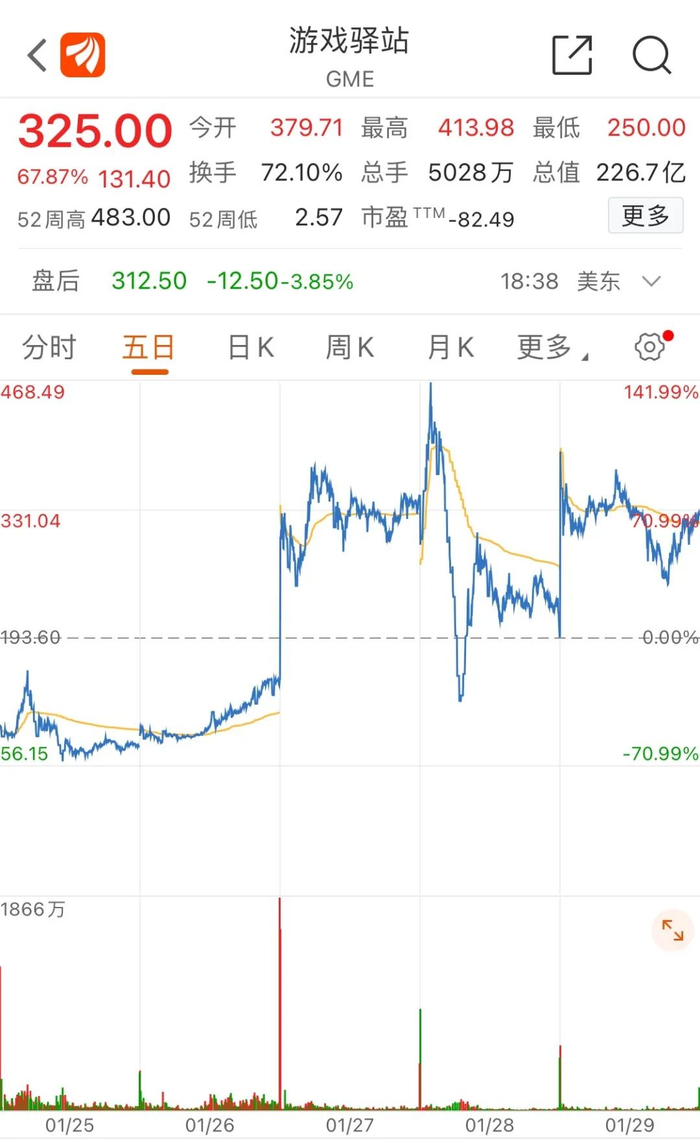 截至收盘,游戏驿站(GME)涨超60%,股价在325美元左右,市值226.7亿美元。而一周前,该股市值不足50亿美元。
