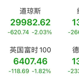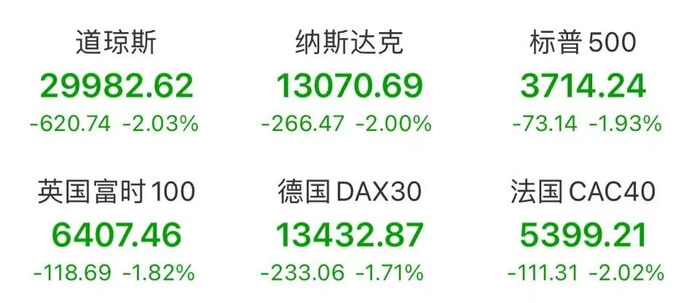 截止收盘,道指跌620.74点,报29982.62点,跌幅2.03%;纳指跌266.46点,报13070.70点,跌幅2.00%;标普500指数跌73.14点,报3714.24点,跌幅1.93%。欧股主要指数全线收跌。