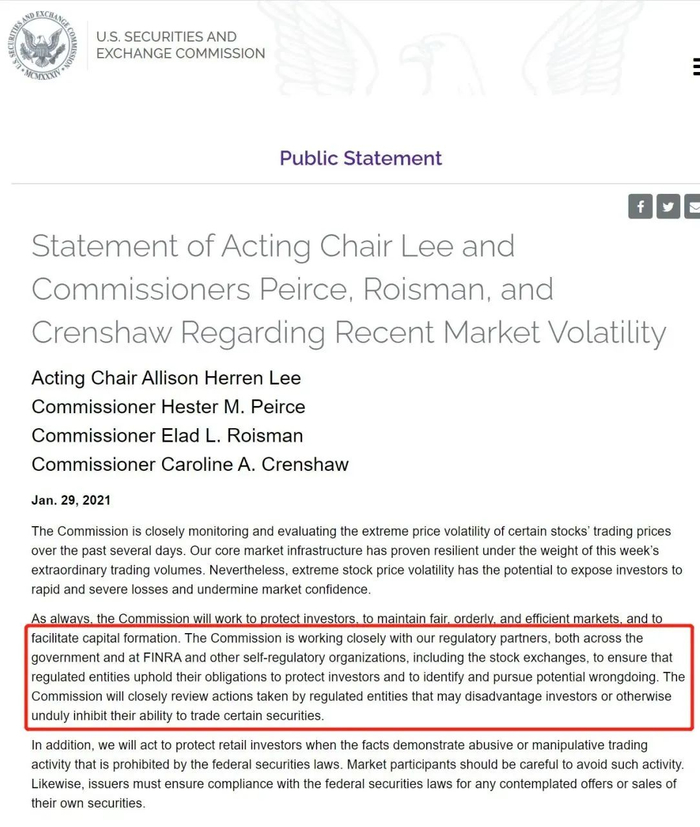 “委员会正在与我们的监管合作伙伴紧密合作,无论是在政府内部、还是在美国金融业监管局FINRA、以及包括股票交易所在内的其他自我监管组织,以确保受监管实体履行保护投资者的责任,并确定和追查潜在的不法行为。将密切审查受监管实体采取的可能不利于投资者、或以其他方式不适当地抑制其交易某些证券的能力的行动。”