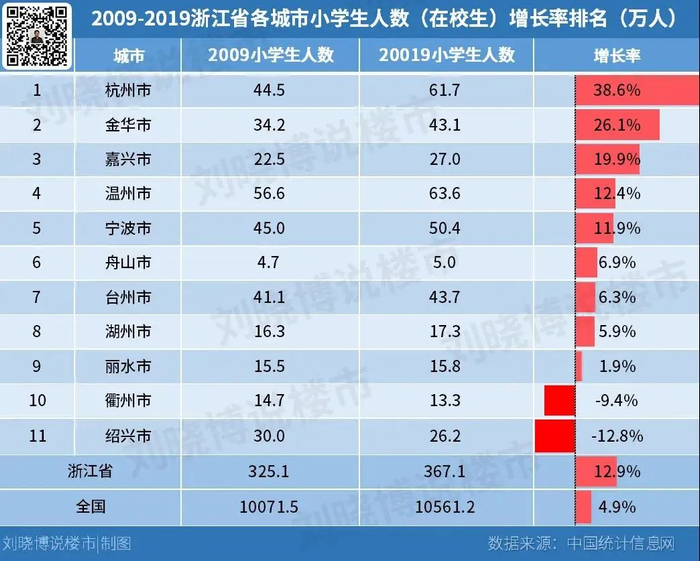 从小学生人数的增长也能看出,温州的人气指数远不如杭州,也被金华、嘉兴远远超过。