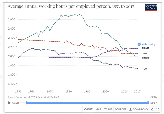 同时期韩国为了经济赶超,疯狂时几乎全民996,工作时长一度达到恐怖的3000小时,为德国的两倍。