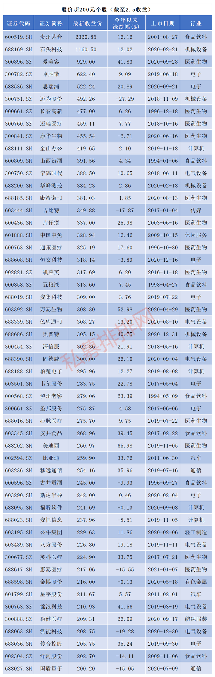 最新收盘价最高的是贵州茅台,股价为2320.85元,石头科技是仅次于贵州茅台的第二只千元股,最新股价为1160.50元,爱美客最新收盘价为929元,距离步入千元股行列也仅一步之遥,是最有潜力的千元阵营“候选股”。